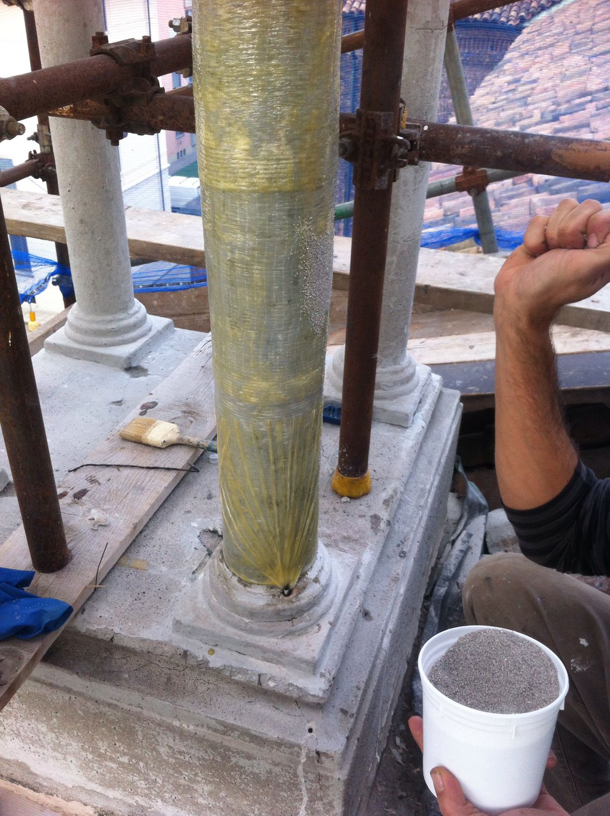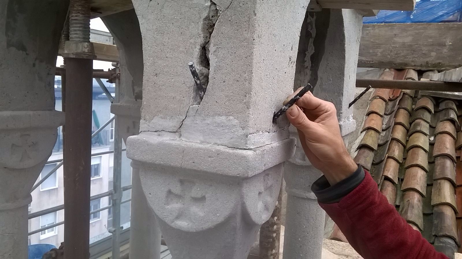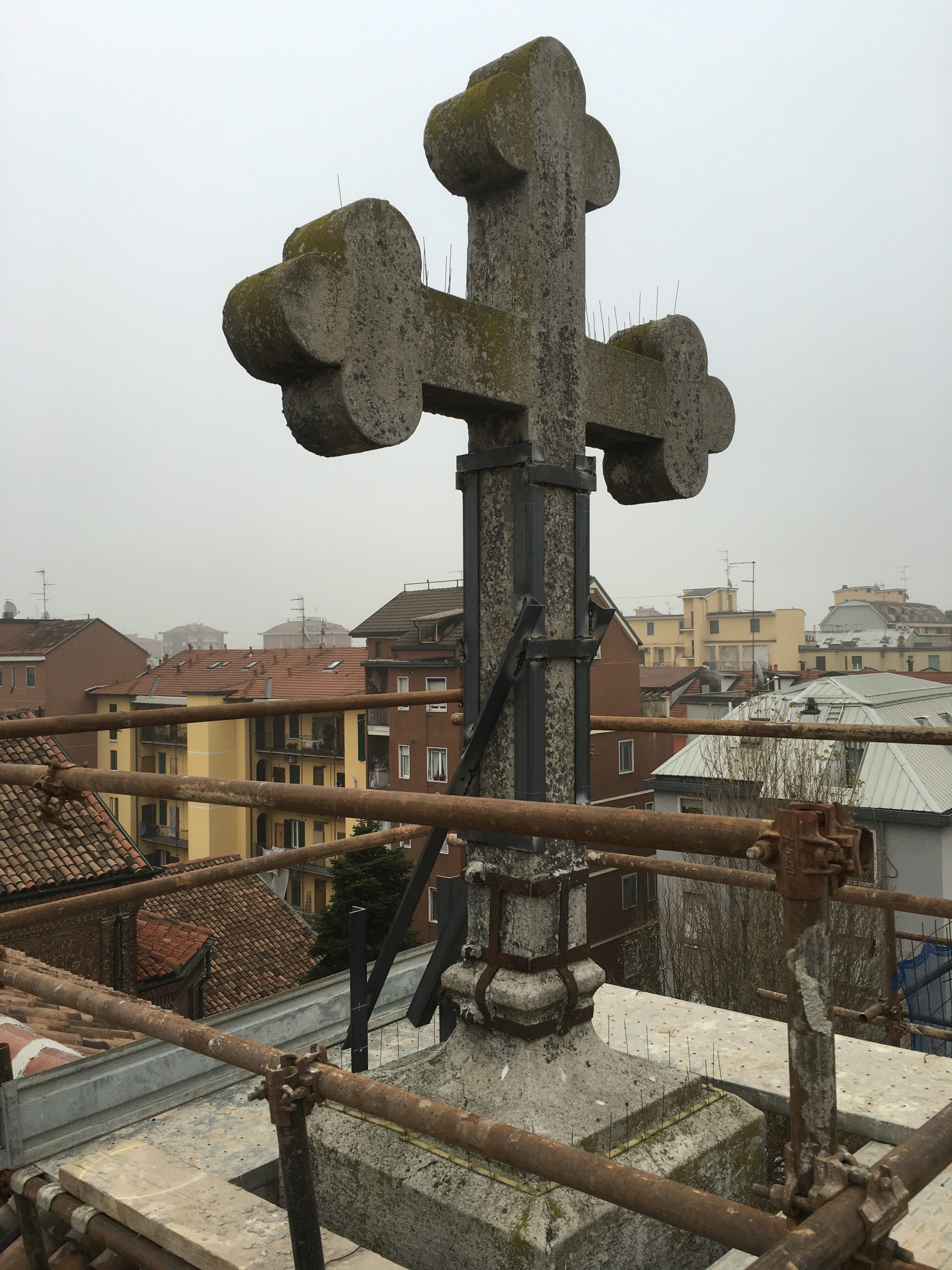 Per la Croce è stata realizzata una struttura provvisoria di contenimento e ancoraggio in metallo in modo da limitare il più possibile lo spostamento dell’elemento verticale.